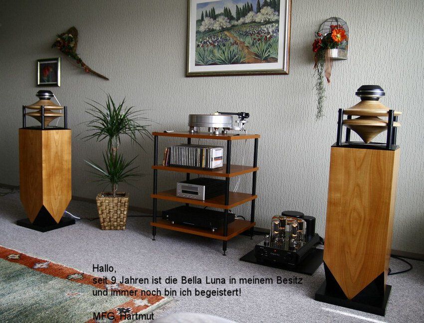I am very happy with the Bella Lunas. I have owned a number of different types of loudspeakers, mainly horns such as Avantgarde Duos. As you would expect, the listening experience with the Bella Lunas is quite different from a directional horn speaker, but I think in many ways I am finding the most satisfying and enjoyable listening with the Bella Lunas.