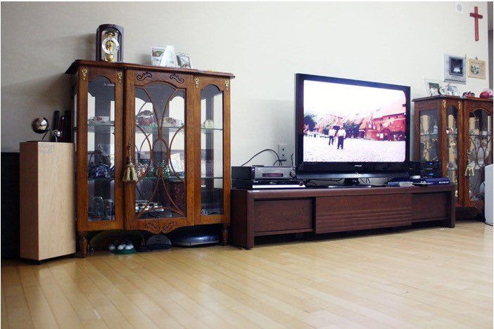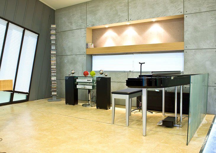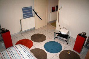 Ich bin selbst Musiker und habe mit meiner Band in vielen schlimmen Räumen spielen müssen. Ich weiß wie grottig eine PA in einem gefliesten Raum klingt. Nach unserem Umzug ist mein Musik- und Arbeitszimmer ein halbrunder Raum mit 3m hoher Decke, 26 qm Fläche, 3 alten Doppelfenstern, die man mit Vorhängen absolut entstellen würde, 2 Bücherschränken mit verglasten Fronten, einer Tür mit Glaseinsatz, Parkettboden. Die akustische Katastrophe. Und ich wollte in diesem Raum einen guten Stereo-Sound an allen Punkten des Raumes haben. Außerdem habe ich manchmal das Bedürfnis, zum Musikhören auf dem Teppich zu liegen.