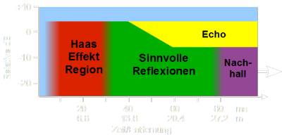 Diese Grafik verdeutlicht die Leistungsfähigkeit unseres Gehörs, bei dem die frühen Reflexionen <30ms also Boden-, Wand- und Deckenreflexionen nicht als separate Schallereignisse gedeutet sondern dem Ursprungston zugeordnet werden. Darüber hinaus erfährt das subjektive Erleben des Tons einen volleren und räumlicheren Eindruck als lediglich der Ursprungston.