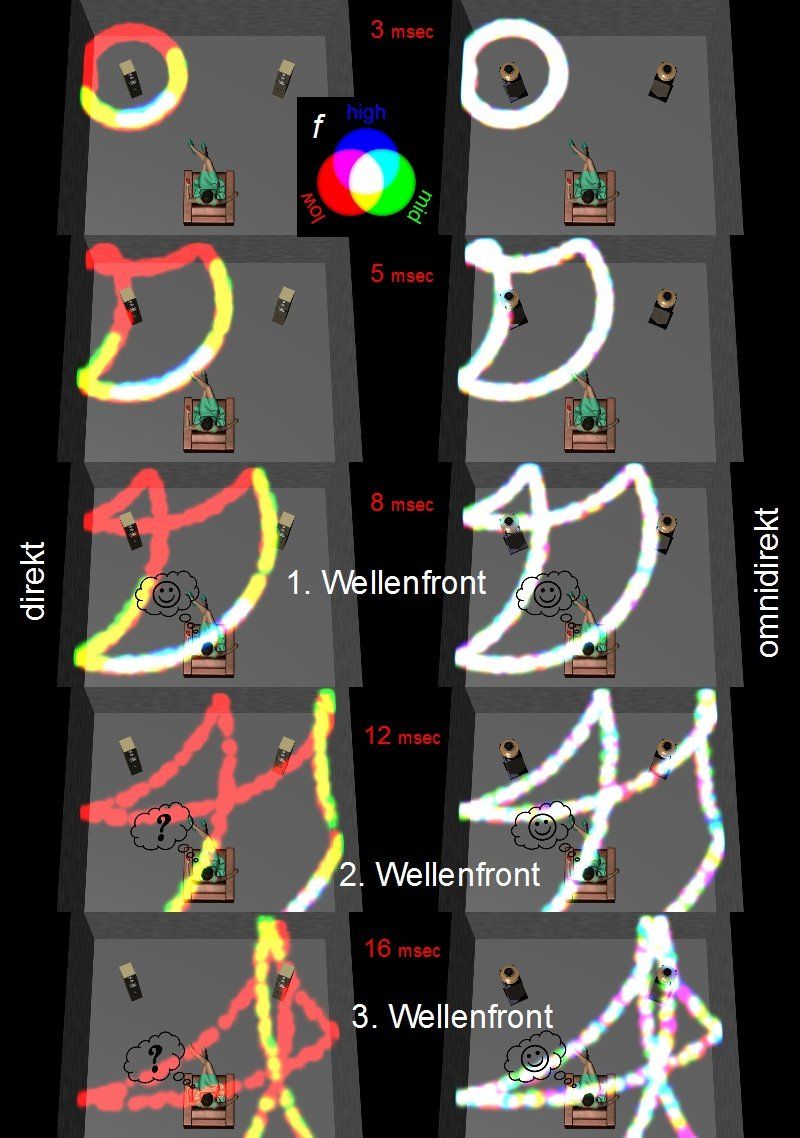 Idealerweise sollten die Reflexionen des Originalschalls einen „similaren“ also gleichen Höreindruck hinterlassen wie der Ursprungston. Das kann von breitabstrahlenden Systemen, am besten Kugelschallquellen, geleistet werden, da direkt abstrahlende Lautsprecher zwar im Bassbereich durchaus omnidirektional sind, aber die höheren Frequenzen nur zielgerichtet nach vorne wiedergeben können. Das bedeutet, die erste Schallwelle erreicht den Hörer über die gesamte Frequenzbreite, die für den räumlichen Höreindruck und Klangfarben so wichtigen Obertöne erfahren lediglich eine unvollständige Reflexion, selbst wenn man sich im idealen Hördreieck des direkt abstrahlenden Lautsprechers befindet. Fatal, dass der Mensch 3x mehr Nervenzellen für die höheren Frequenzen besitzt als für die tiefen, daraus lässt sich die Wichtigkeit gerade dieser höherfrequenten Reflexionen ablesen. Wie reagiert der menschliche Organismus eigentlich auf diesen unnatürlichen, in den Höhen stark fokussierten Schalldruck? Mit Stress oder Entspannung? Aber warum beschäftigen wir uns überhaupt mit Raumreflexionen, wo doch im „Idealfall“ die Tonaufnahme nicht vom Indirektschall (bedingt und zusätzlich erzeugt durch den Hörraum) beeinflusst werden sollte und so den Höreindruck verfremden könnte. Dieser Anspruch erfüllt sich bloß im schalltoten Raum, ansonsten gilt: Alles was wir hören, ist ein Produkt aus Originalschallquelle und dem umgebenden Raum.