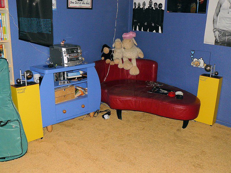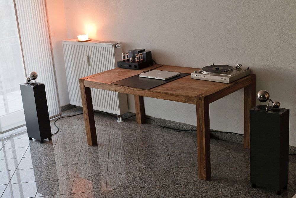 Mir war klar: Mit „klassischen“ Lautsprechern konnte das in diesem Zimmer nichts werden, außer man steht auf den Sound in einem leeren 50m Schwimmbecken. Ich hatte, um mir das zu beweisen, aus Spaß meine alten Standboxen aus Studententagen aufgestellt, das Wort „Zumutung“ ist zu wenig drastisch für den Brei, der da herauskam.