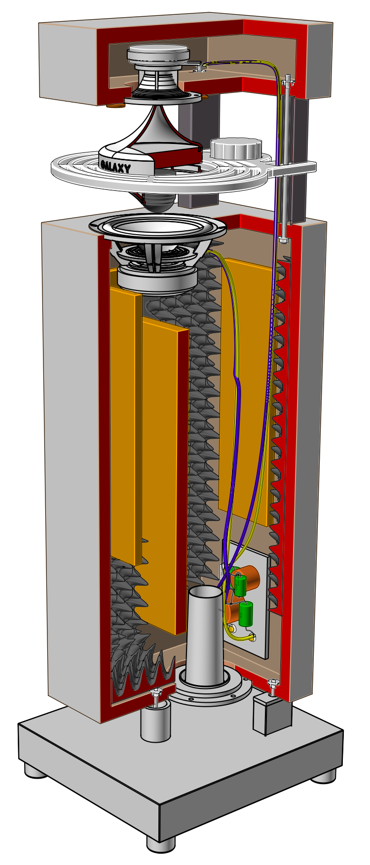 Die GALAXY ist ein 2 Wege System mit 17cm Woofer und einem 1Zoll Horntweeter, sie ist 95cm hoch, 28cm(31cm) tief und 23cm(30cm) breit. Wahlweise mit schwarzer oder Acryl Akustiklinse, die Letztere lässt sich beleuchten.